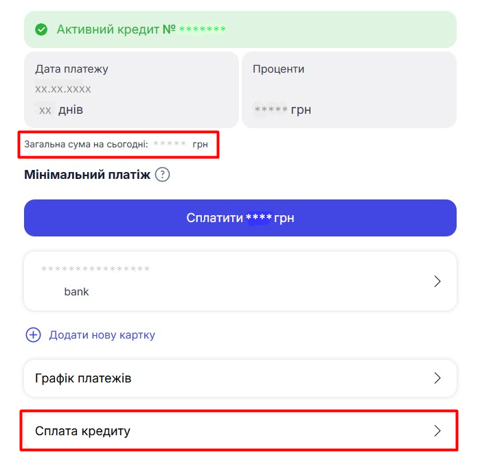 1️⃣ Переконайтеся, що ви внесли всю суму до погашення. Для цього в особистому кабінеті зверніть увагу на рядок «Загальна сума на сьогодні» — тут ви побачите необхідну суму для закриття. Для оплати натисніть кнопку «Сплата кредиту» та внесіть необхідну суму.