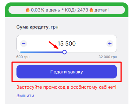 Не забудьте використати промокод 7845, який дозволить вам протягом перших 15 днів користуватися кредитом без додаткових витрат — всього 0,01% на добу.
