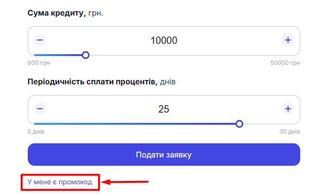 Промокод на знижку потребує активації в момент оформлення заявки в спеціально призначеному полі під кредитним калькулятором в особистому кабінеті.