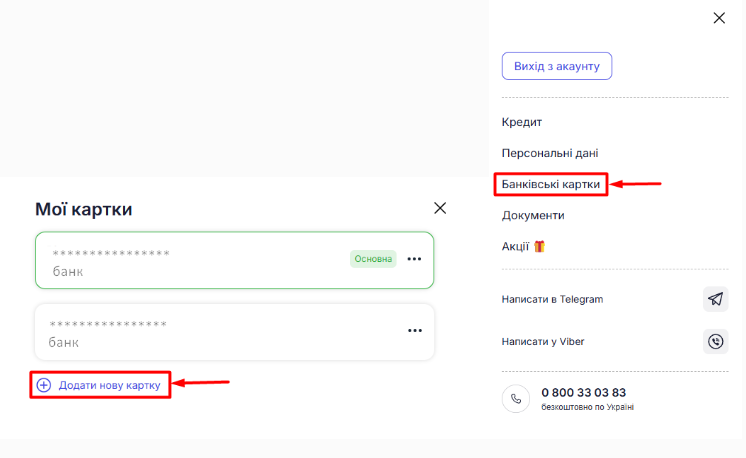 Щоб додати нову картку, перейдіть у розділ «Банківські картки» в особистому кабінеті та оберіть опцію «Додати нову картку». Після додавання картки натисніть на неї, і вона буде позначена як «Основна».